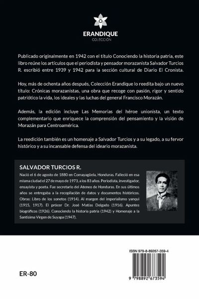 Publicado originalmente en 1942 con el título Conociendo la historia patria, este libro reúne los artículos que el periodista y pensador morazanista Salvador Turcios R. escribió entre 1939 y 1942 para la sección cultural de Diario El Cronista. Hoy, más de ochenta años después, Colección Erandique lo reedita bajo un nuevo título: Crónicas morazanistas, una obra que recoge con pasión, rigor y sentido patriótico la vida, los ideales y las luchas del general Francisco Morazán. Además, la edición incluye Las Memorias del héroe unionista, un texto complementario que enriquece la comprensión del pensamiento y la visión de Morazán para Centroamérica. La reedición también es un homenaje a Salvador Turcios y a su legado, a su fervor histórico y a su incansable defensa del ideario morazanista.Sobre el autor: SALVADOR TURCIOS R. Nació el 6 de agosto de 1880 en Comayagüela, Honduras. Falleció en esa misma ciudad el 27 de mayo de 1973, a los 83 años. Periodista, investigador, ensayista y poeta. Fue secretario del Ateneo de Honduras. En sus últimos años se entregaba a la recopilación de datos y documentos históricos. Obras: Libro de los sonetos (1914). Al margen del imperialismo yanqui (1915, 1917). El prócer Dr. José Matías Delgado (1916). Apuntes biográficos (1926). Conociendo la historia patria (1942) y Homenaje a la Santísima Virgen de Suyapa (1947).