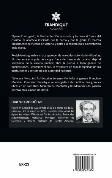 "Apareció un genio; la libertad le ciñó la espada, y lo puso al frente del civismo. Él apareció inspirado por la patria y por la gloria. Él marcha rápidamente de victoria en victoria, y entra a la capital con la Constitución en la mano. Restablece la gran ley y hace aparecer de nuevo las autoridades disueltas. No derrama una gota de sangre fuera del campo de batalla; aleja el servilismo de la escena pública; abre la prensa a todo género de publicaciones. Reorganiza el país, lo restablece en toda la dignidad de sus instituciones y se somete a la autoridad nacional. "Este era Morazán". Así describe Lorenzo Montufar al general Francisco Morazán. Colección Erandique se enorgullece de publicar dos grandes obras en un solo libro: Morazán de Montúfar y las Memorias del paladín escritas en la ciudad de David.