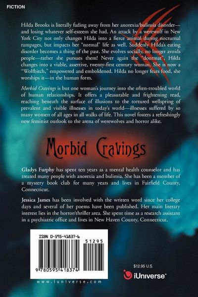 Hilda Brooks is literally fading away from her anorexia/bulimia disorder-and losing whatever self-esteem she had. An attack by a werewolf in New York City not only changes Hilda into a fierce animal during nocturnal rampages, but impacts her "normal" life as well. Suddenly Hilda's eating disorder becomes a thing of the past. She evolves socially, no longer avoids people-rather she pursues them! Never again the "doormat", Hilda changes into a viable, assertive, twenty-first century woman. She is now a "Wolfbitch," empowered and emboldened. Hilda no longer fears food, she worships it-in the human form. Morbid Cravings is but one woman's journey into the often-troubled world of human relationships. It offers a pleasurable and frightening read, reaching beneath the surface of illusions to the tortured wellspring of prevalent and visible illnesses in today's world-illnesses suffered by so many women of all ages in all walks of life. This novel fosters a refreshingly new feminist outlook to the arena of werewolves and horror alike.