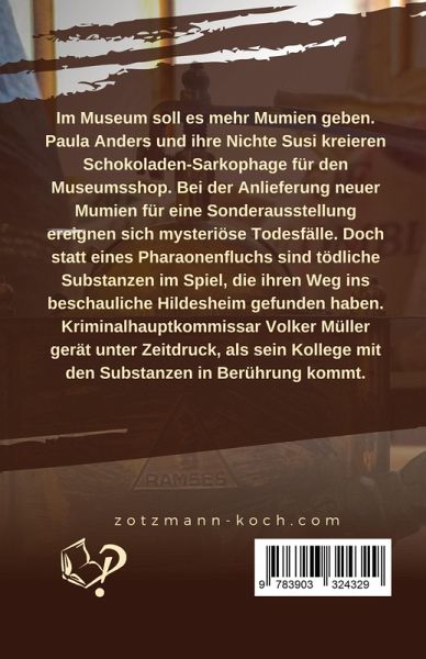 Im Museum soll es mehr Mumien geben. Paula Anders und ihre Nichte Susi kreieren Schokoladen-Sarkophage für den Museumsshop. Bei der Anlieferung neuer Mumien für eine Sonderausstellung ereignen sich mysteriöse Todesfälle. Doch statt eines Pharaonenfluchs sind tödliche Substanzen im Spiel, die ihren Weg ins beschauliche Hildesheim gefunden haben. Kriminalhauptkommissar Volker Müller gerät unter Zeitdruck, als sein Kollege mit den Substanzen in Berührung kommt.