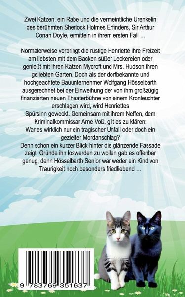 Zwei Katzen, ein Rabe und die vermeintliche Urenkelin des berühmten Sherlock Holmes Erfinders, Sir Arthur Conan Doyle, ermitteln in ihrem ersten Fall ... Normalerweise verbringt die rüstige Henriette ihre Freizeit am liebsten mit dem Backen süßer Leckereien oder genießt mit ihren Katzen Mycroft und Mrs. Hudson ihren geliebten Garten. Doch als der dorfbekannte und hochgeachtete Bauunternehmer Wolfgang Hösselbarth ausgerechnet bei der Einweihung der von ihm großzügig finanzierten neuen Theaterbühne von einem Kronleuchter erschlagen wird, wird Henriettes Spürsinn geweckt. Gemeinsam mit ihrem Neffen, dem Kriminalkommissar Arne Voß, gilt es zu klären: War es wirklich nur ein tragischer Unfall oder doch ein gezielter Mordanschlag? Denn schon ein kurzer Blick hinter die glänzende Fassade zeigt: Gründe ihn loswerden zu wollen gab es offenbar genug, denn Hösselbarth Senior war weder ein Kind von Traurigkeit noch besonders friedliebend ...