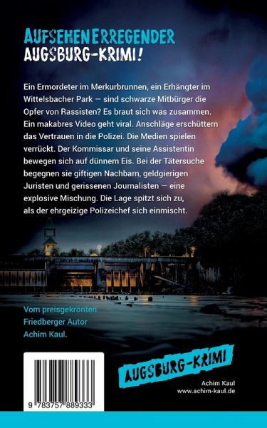 Ein Ermordeter im Merkurbrunen, ein Erhängter im Wittelsbacher Park: sind schwarze Mitbürger die Opfer von Rassisten? Ein makabres Video geht viral. Anschläge erschüttern das Vertrauen in die Polizei. Die Medien spielen verrückt. Entwickelt Augsburg sich zu einer kriminellen Hochburg? Kommissar Zweifel und seine Assistentin Zick bewegen sich auf dünnem Eis. Bei der Tätersuche begegnen sie giftigen Nachbarn, geldgierigen Juristen und gerissenen Journalisten. Die Lage spitzt sich zu, als der Polizeichef sich einmischt.