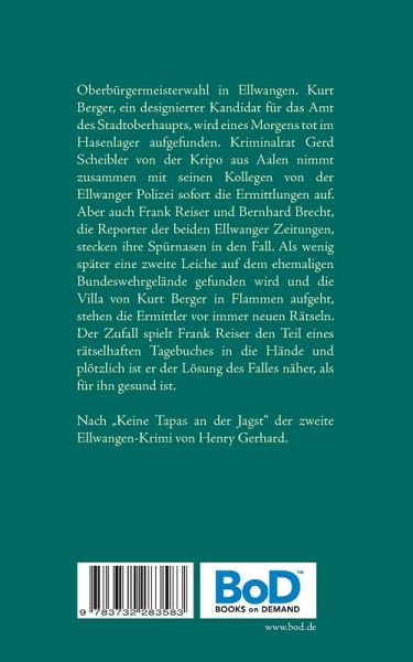 Oberbürgermeisterwahl in Ellwangen. Kurt Berger, ein designierter Kandidat für das Amt des Stadtoberhaupts, wird eines Morgens tot im Hasenlager aufgefunden. Kriminalrat Gerd Scheibler von der Kripo aus Aalen nimmt zusammen mit seinen Kollegen von der Ellwanger Polizei sofort die Ermittlungen auf. Aber auch Frank Reiser und Bernhard Brecht, die Reporter der beiden Ellwanger Zeitungen, stecken ihre Spürnasen in den Fall. Als wenig später eine zweite Leiche auf dem ehemaligen Bundeswehrgelände gefunden wird und die Villa von Kurt Berger in Flammen aufgeht, stehen die Ermittler vor immer neuen Rätseln. Der Zufall spielt Frank Reiser den Teil eines rätselhaften Tagebuches in die Hände, und plötzlich ist er der Lösung des Falles näher, als für ihn gesund ist.Nach "Keine Tapas an der Jagst" der zweite Ellwangen-Krimi von Henry Gerhard.