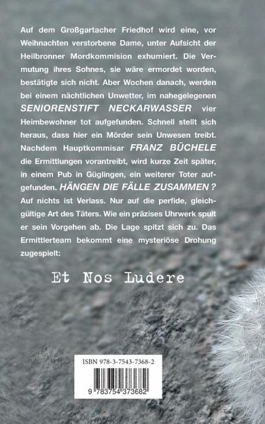 Auf dem Großgartacher Friedhof wird eine, vor Weihnachten verstorbene Dame, unter Aufsicht der Heilbronner Mordkommission exhumiert. Die Vermutung ihres Sohnes, sie wäre ermordet worden, bestätigte sich nicht. Aber Wochen danach, werden bei einem nächtlichen Unwetter, im nahegelegenen Seniorenstift Neckarwasser vier Heimbewohner tot aufgefunden. Schnell stellt sich heraus, dass hier ein Mörder sein Unwesen treibt.Nachdem Hauptkommissar Franz Büchele die Ermittlungen vorantreibt, wird kurze Zeit später, in einem Pub in Güglingen, ein weiterer Toter aufgefunden. Hängen die Fälle zusammen? Auf nichts ist Verlass. Nur auf die perfide, gleichgültige Art des Mörders, kann sich Hauptkommissar Franz Büchele verlassen. Wie ein präzises Uhrwerk spult der Mörder sein Vorgehen ab. Die Lage spitzt sich zu. Das Ermittlerteam bekommt eine mysteriöse Drohung zugespielt:Et Nos Ludere