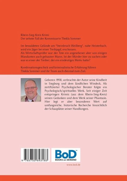 Rhein-Sieg-Kreis KrimiDer zehnte Fall der Kommissarin Thekla SommerIm bewaldeten Gelände des "Steinbruch Weilberg", nahe Heisterbach, wird ein Jäger bei einer Treibjagd erschossen.Als Wirtschaftsprüfer war der Tote ein angesehener aber von einigen Mandanten auch gehasster Mann. Kombinationsgeschick und kriminalistische Erfahrung führen auch diesmal zum Ziel.