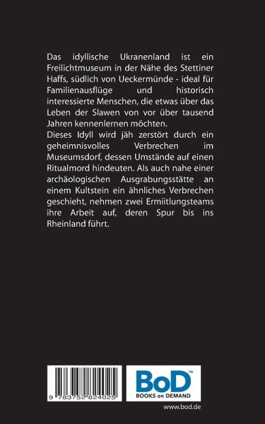 Das idyllische Ukranenland ist ein Freilichtmuseum in der Nähe des Stettiner Haffs, südlich von Ueckermünde - ideal für Familienausflüge und historisch interessierte Menschen, die etwas über das Leben der Slawen von vor über tausend Jahren kennenlernen möchten.Dieses Idyll wird jäh zerstört durch ein geheimnisvolles Verbrechen im Museumsdorf, dessen Umstände auf einen Ritualmord hindeuten. Als auch nahe einer archäologischen Ausgrabungsstätte an einem Kultstein ein ähnliches Verbrechen geschieht, nehmen zwei Ermittlungsteams ihre Arbeit auf, deren Spur bis ins Rheinland führt.
