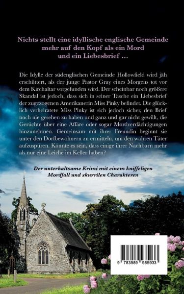 Nichts stellt eine idyllische englische Gemeinde mehr auf den Kopf als ein Mord und ein Liebesbrief … Der unterhaltsame Krimi mit einem kniffeligen Mordfall und skurrilen Charakteren Die Idylle der südenglischen Gemeinde Hollowfield wird jäh erschüttert, als der junge Pastor Gray eines Morgens tot vor dem Kirchaltar vorgefunden wird. Der scheinbar noch größere Skandal ist jedoch, dass sich in seiner Tasche ein Liebesbrief der zugezogenen Amerikanerin Miss Pinky befindet. Die glücklich verheiratete Miss Pinky ist sich jedoch sicher, den Brief noch nie gesehen zu haben und ganz und gar nicht gewillt, die Gerüchte über eine Affäre oder sogar Mordverdächtigungen hinzunehmen. Gemeinsam mit ihrer Freundin beginnt sie unter den Dorfbewohnern zu ermitteln, um den wahren Täter aufzuspüren. Könnte es sein, dass einige ihrer Nachbarn mehr als nur eine Leiche im Keller haben? Dies ist eine überarbeitete Neuausgabe des bereits erschienenen Titels Miss Pinky und der tote Pastor. Erste Leser:innenstimmen „Miss Pinky ist eine sympathische und entschlossene Protagonistin, die zusammen mit ihrer Freundin ein beeindruckendes Detektiv-Duo abgibt." „Dieser Cosy Krimi schafft es, eine perfekte Balance zwischen gemütlicher Dorfidylle und spannender Kriminalgeschichte zu halten." „Ein Muss für Fans von britischen Krimis zum Lachen und Miträtseln!" „Miss Pinky und ihre Freundin sind ein tolles Ermittlerteam, das durch Witz und Cleverness überzeugt."