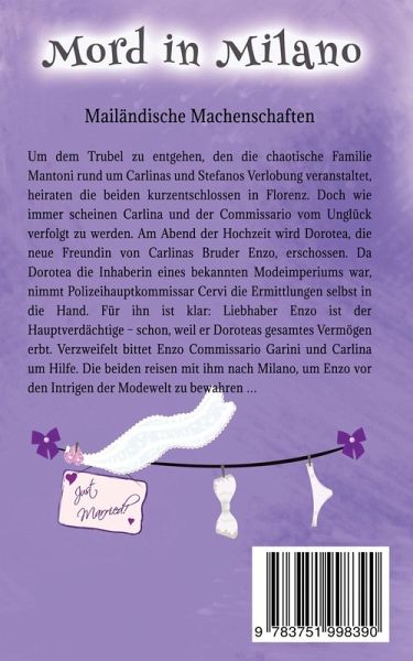 Mailändische Machenschaften Um dem Trubel zu entgehen, den die chaotische Familie Mantoni rund um Carlinas und Stefanos Verlobung veranstaltet, heiraten die beiden kurzentschlossen in Florenz. Doch wie immer scheinen Carlina und der Commissario vom Unglück verfolgt zu werden: Am Abend der Hochzeit wird Dorotea, die neue Freundin von Carlinas Bruder Enzo, erschossen. Da Dorotea die Inhaberin eines bekannten Modeimperiums war, nimmt Polizeihauptkommissar Cervi die Ermittlungen selbst in die Hand. Für ihn ist klar: Liebhaber Enzo ist der Hauptverdächtige - schon, weil er Doroteas gesamtes Vermögen erbt. Verzweifelt bittet Enzo Commissario Garini und Carlina um Hilfe. Die beiden reisen mit ihm nach Mailand, um Enzo vor den Intrigen der Modewelt zu bewahren ...