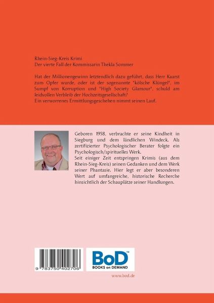 Rhein-Sieg-Kreis KrimiDer vierte Fall der Kommissarin Thekla SommerHat der Millionengewinn letztendlich dazu geführt, dass Herr Kaarst zum Opfer wurde, oder ist der sogenannte "kölsche Klüngel", im Sumpf von Korruption und "High Society Glamour", schuld am leidvollen Verbleib der Hochzeitsgesellschaft?Ein verworrenes Ermittlungsgeschehen nimmt seinen Lauf.