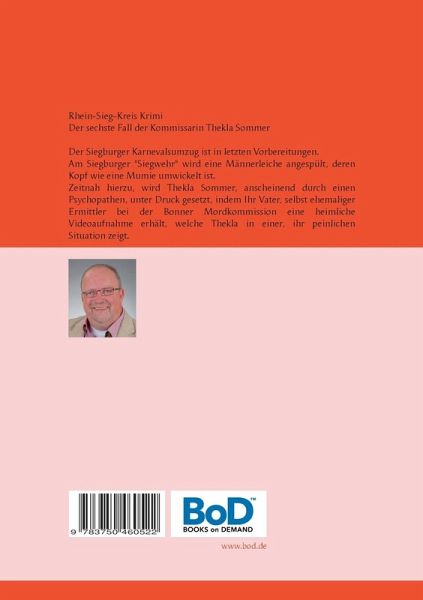 Rhein-Sieg-Kreis KrimiDer sechste Fall der Kommissarin Thekla SommerDer Siegburger Karnevalsumzug ist in letzten Vorbereitungen.Am Siegburger "Siegwehr" wird eine Männerleiche angespült, deren Kopf wie eine Mumie umwickelt ist.Zeitnah hierzu, wird Thekla Sommer, anscheinend durch einen Psychopathen, unter Druck gesetzt, indem Ihr Vater, selbst ehemaliger Ermittler bei der Bonner Mordkommission eine heimliche Videoaufnahme erhält, welche Thekla in einer, ihr peinlichen Situation zeigt.