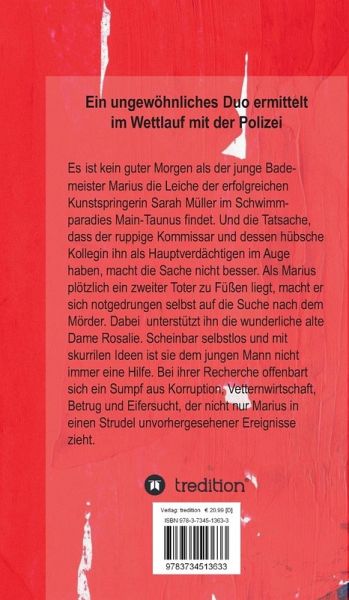 Es ist kein guter Morgen als der junge Bademeister Marius die Leiche der erfolgreichen Kunstspringerin Sarah Müller im Schwimmparadies Main-Taunus findet. Und die Tatsache, dass der ruppige Kommissar und dessen hübsche Assistentin ihn als Hauptverdächtigen im Auge haben, macht die Sache nicht besser. Als Marius plötzlich ein zweiter Toter zu Füßen liegt, macht er sich notgedrungen selbst auf die Suche nach dem Mörder. Dabei unterstützt ihn die wunderliche alte Dame Rosalie. Scheinbar selbstlos und mit skurrilen Ideen ist sie dem jungen Mann nicht immer eine Hilfe. Bei ihrer Recherche offenbart sich ein Sumpf aus Korruption, Vetternwirtschaft Betrug und Eifersucht, der nicht nur Marius in einen Strudel unvorhergesehener Ereignisse zieht.