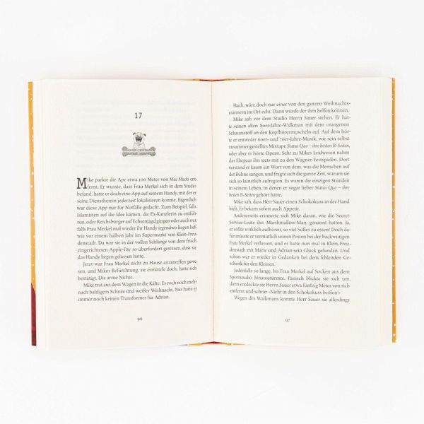 Der Fall wird restlos aufgeklärt und das Buch endet in harmonisch weihnachtlicher Stimmung. Der kleine Adrian spielt mit seinem heißersehnten Bone Crusher Transformer, Mikes Gäste feiern begeistert mit seiner Familie und den Merkels. Puffel überrascht seine Puffeline mit einem kostbaren Geschenk. Und Angela? Schämt sich, weil sie kein Geschenk für ihren Liebsten hat. Doch sie hat die Rechnung ohne den Weihnachtsmann gemacht.