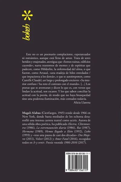 Este no es un poemario complaciente, esperanzador ni romántico, aunque está lleno de amor. Trata de seres heridos y enajenados, atestigua que «Somos ruinas, edificios cayendo», narra trastornos de mentes y de espíritus que padecen, como Hölderlin, la enfermedad del alma, o que fueron, como Artaud, «una madeja de hilos enredados / que impacienta a los demás», o que se autoimponen, como Camille Claudel, un largo y prolongado encierro: «Su interior confuso / ha roto el contrato con el mundo». […] Los poetas que se aventuran y dicen lo que es, con versos que lindan la acritud, son escasos. Y los que saben conciliar la acritud con la poesía, de modo que no haya brusquedad sino una poderosa iluminación, más contados todavía. (Alicia Llarena) Magali Alabau (Cienfuegos, 1945) reside desde 1966 en New York, donde hasta mediados de los ochenta desarrolló una intensa carrera teatral como actriz. Autora de una sólida obra poética, ha publicado Electra, Clitemnestra (1986), La extremaunción diaria (1986), Ras (1987), Hermana (1989), Hemos llegado a Ilión (1992), Liebe (1993) y -tras una pausa de casi dos décadas- Dos Mujeres (2011), Volver (2012) y Amor Fatal (2016), recogidos todos en Ir y venir. Poesía reunida 1986-2016 (2017).