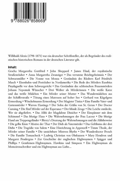 Willibald Alexis (1798-1871) war ein deutscher Schriftsteller, der als Begründer des realistischen historischen Romans in der deutschen Literatur gilt. Inhalt: . Gescha Margaretha Gottfried . John Sheppard . James Hind, der royalistische Straßenräuber . Anna Margaretha Zwanziger . Das verratene Beichtgeheimnis . Der Schwarzmüller . Die Nonne von Monza . Geständnis des Räubers Karl Friedrich Masch . Eisenbahn-und Posträuber in Nordamerika . Die Rede des Mörders Eusebius Pieydagnelle vor dem Schwurgericht . Das Geständnis des schlesischen Frauenmörders Johann Nepomuk Wünscher . Drei Weiber als Mörderinnen . Die weiße Katze und das weiße Mädchen . Ein Mörder seiner Mutter . Das Wundermädchen aus der Schifferstraße . Tötung eines Matrosen auf hoher See . Gerhard von Kügelgens Ermordung . Winckelmanns Ermordung . Der Magister Tinius . Eine Familie Vater-und Gattenmörder . Warren Hastings . Der Sohn der Gräfin von St. Geran . Der Doctor Castaing . Die fünf Mörder auf der Esperance . Der blinde Zeuge . Die Leiche entdeckt. Wer sie abgeliefert. . Das Alibi der Magdalene Dinicher . Der Einspänner mit dem Schimmel . Das blutige Haus . Die Wahrnehmungen der Frau Lacour . Die blutige Hand am Treppengeländer . Bletry's Deutung der Wahrnehmungen und die Alibibeweise . Die gelbe Kiste . Motive der That . Der Dieb als Vatermörder . Das Gelöbniss der drei Diebe . Die Tragödie von Salem . Eine Hinrichtung in Appenzell . Timm Thode, der Mörder seiner Familie . Die unsichtbare Mistress Blythe . Der Wunderdoctor Frosch . Die Familie Tomascheck . Ludwig Christian von Olnhausen . Mary Hendron und Margaret Pendergras . Zur Geschichte der englischen Highwaymen . Spiggot und Phillips . Gentlemen-Highwaymen. Hawkins und Simpson . Ein Highwayman als Memoirenschreiber und ein Highwayman aus Liebe...