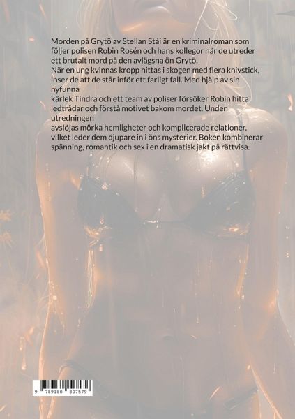 Morden på Grytö" av Stellan Stái är en kriminalroman som följer polisen Robin Rosén och hans kollegor när de utreder ett brutalt mord på den avlägsna ön Grytö. När en ung kvinnas kropp hittas i skogen med flera knivstick, inser de att de står inför ett farligt fall. Med hjälp av sin nyfunna kärlek Tindra och ett team av poliser försöker Robin hitta ledtrådar och förstå motivet bakom mordet. Under utredningen avslöjas mörka hemligheter och komplicerade relationer, vilket leder dem djupare in i öns mysterier. Boken kombinerar spänning, romantik och sex i en dramatisk jakt på rättvisa.