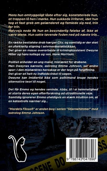 Mens hun omhyggeligt låste efter sig, konstaterede hun, at trappen lå hen i mørke. Hun sukkede irriteret, idet hun tog et fast greb om gelænderet og famlede sig ned, trin for trin. Halvvejs nede fik hun en besynderlig følelse af, ikke at være alene. Hun satte tøvende foden ned på næste trin ... En række bestialske drab hærger City, og samtidig er der sket en uforklarlig stigning i selvmordsstatistikken. Det giver en masse overarbejde til kriminalassistent Dwayne Miller og hans kollega og ven, Hank Morrison. Politiet anholder en ung mand, mistænkt for drabene. Men Dwaynes kæreste, astrolog Emma Johnson, ser andre spor: I den mistænktes horoskop er der tegn på forgiftning. Det giver en helt ny indfaldsvinkel til sagen. Dwayne kan imidlertid ikke som politimand bruge hendes alternative teori til noget. Det får Emma og hendes veninde, Abby, til i al hemmelighed at starte deres egen efterforskning ad utraditionelle veje. Samtidig ignorerer Emma uheldigvis en stærk intuition om, at en katastrofe nærmer sig ... "Mordets Filosofi" er anden bog i serien "Stjernehimmel" med astrolog Emma Johnson.