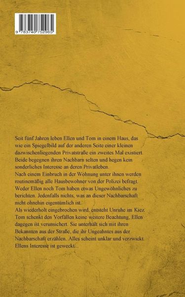 Seit fünf Jahren leben Ellen und Tom in einem Haus, das wie ein Spiegelbild auf der anderen Seite einer kleinen dazwischenliegenden Privatstraße ein zweites Mal existiert. Beide begegnen ihren Nachbarn selten und hegen kein sonderliches Interesse an deren Privatleben. Nach einem Einbruch in der Wohnung unter ihnen werden routinemäßig alle Hausbewohner von der Polizei befragt. Weder Ellen noch Tom haben etwas Ungewöhnliches zu berichten. Jedenfalls nichts, was an dieser Nachbarschaft nicht ohnehin eigentümlich ist.Als wiederholt eingebrochen wird, entsteht Unruhe im Kiez. Tom schenkt den Vorfällen keine weitere Beachtung, Ellen dagegen ist verunsichert. Sie unterhält sich mit ihren Bekannten aus der Straße, die ihr Ungeahntes aus der Nachbarschaft erzählen. Alles scheint unklar und verzwickt. Ellens Interesse ist geweckt...