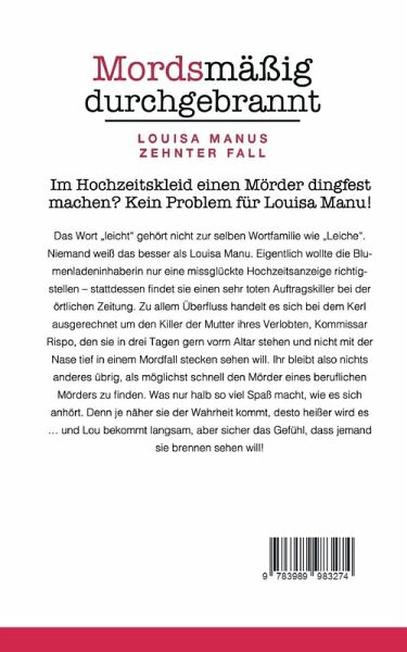 Im Hochzeitskleid einen Mörder dingfest machen? Kein Problem für Louisa Manu! Die erfolgreiche Cosy Crime-Reihe von Bestsellerautorin Saskia Louis geht voller Spannung und Humor weiter Das Wort „leicht" gehört nicht zur selben Wortfamilie wie „Leiche". Niemand weiß das besser als Louisa Manu. Eigentlich wollte die Blumenladeninhaberin nur eine missglückte Hochzeitsanzeige richtigstellen – stattdessen findet sie einen sehr toten Auftragskiller bei der örtlichen Zeitung. Zu allem Überfluss handelt es sich bei dem Kerl ausgerechnet um den Killer der Mutter ihres Verlobten, Kommissar Rispo, den sie in drei Tagen gern vorm Altar stehen und nicht mit der Nase tief in einem Mordfall stecken sehen will. Ihr bleibt also nichts anderes übrig, als möglichst schnell den Mörder eines beruflichen Mörders zu finden. Was nur halb so viel Spaß macht, wie es sich anhört. Denn je näher sie der Wahrheit kommt, desto heißer wird es … und Lou bekommt langsam, aber sicher das Gefühl, dass jemand sie brennen sehen will! Alle Bände der Louisa-Manu-Reihe können unabhängig voneinander gelesen werden. Weitere Titel dieser Reihe Mordsmäßig unverblümt (ISBN: 9783945298725) Mordsmäßig verstrickt (ISBN: 9783960870760) Mordsmäßig kaltgemacht (ISBN: 9783960871262) Mordsmäßig angefressen (ISBN: 9783960874201) Mordsmäßig verkatert (ISBN: 9783960876731) Mordsmäßig versaut (ISBN: 9783968172163) Mordsmäßig gerädert (ISBN: 9783968177489) Mordsmäßig angetrunken (ISBN: 9783986376352) Mordsmäßig verkorkst (ISBN: 9783987781414) Erste Leser:innenstimmen „Endlich ist meine Lieblingsermittlerin wieder am Start! Habe den Krimi nur so verschlungen." „Ich liebe den humorvollen Schreibstil von Saskia Louis, einfach unvergleichlich!" „Eine der besten Cosy Crime-Reihen, kann ich jedem nur ans Herz legen." „Spannung und Humor perfekt kombiniert!"