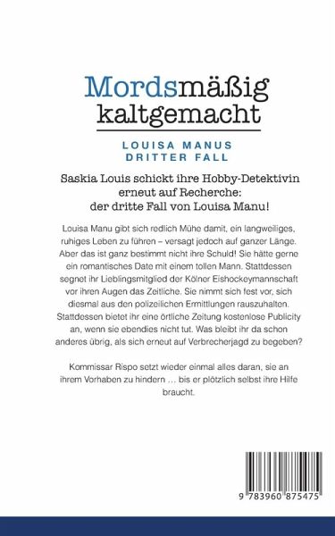 freie Journalistin Louisa Manu, hat sich zu einem Date mit dem Testosteronlosen Koch hinreisen…mehrDer Krimiroman "Mordsmässig kaltgemacht"", ist der dritte Band der Louisa Manu-Reihe, in dem Sharky das Maskottchen der Kölner Haie plötzlich vor dem Spiel zusammen bricht, und Louisa erneut auf Verbrecherjagd schickt, geschrieben von Saskia Louis.