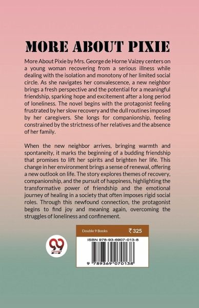 More About Pixie by Mrs. George de Horne Vaizey centers on a young woman recovering from a serious illness while dealing with the isolation and monotony of her limited social circle. As she navigates her convalescence, a new neighbor brings a fresh perspective and the potential for a meaningful friendship, sparking hope and excitement after a long period of loneliness. The novel begins with the protagonist feeling frustrated by her slow recovery and the dull routines imposed by her caregivers. She longs for companionship, feeling constrained by the strictness of her relatives and the absence of her family. When the new neighbor arrives, bringing warmth and spontaneity, it marks the beginning of a budding friendship that promises to lift her spirits and brighten her life. This change in her environment brings a sense of renewal, offering a new outlook on life. The story explores themes of recovery, companionship, and the pursuit of happiness, highlighting the transformative power of friendship and the emotional journey of healing in a society that often imposes rigid social roles. Through this newfound connection, the protagonist begins to find joy and meaning again, overcoming the struggles of loneliness and confinement.