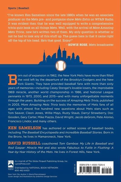 Born out of expansion in 1962, the New York Mets have more than filled the void left by the departure of the Brooklyn Dodgers and New York Giants. They have provided baseball fans in New York and around the baseball world with more than sixty years of memories including Casey Stengel's lovable losers, the improbable 1969 miracle, another world championship in 1986, and National League pennants in 1973, 2000, and 2015, with many unforgettable moments through the years. Building on the success of Amazing Mets Trivia, published in 2003, More Amazing Mets Trivia tests the memories of Mets fans of all ages with almost five hundred new questions about such Mets stars as Tom Seaver, Cleon Jones, Willie Mays, Rusty Staub, Dave Kingman, Lee Mazzilli, Darryl Strawberry, Doc Gooden, Keith Hernandez, Gary Carter, Mike Piazza, David Wright, Jacob de Grom, Pete Alonso, Francisco Lindor, and many others.