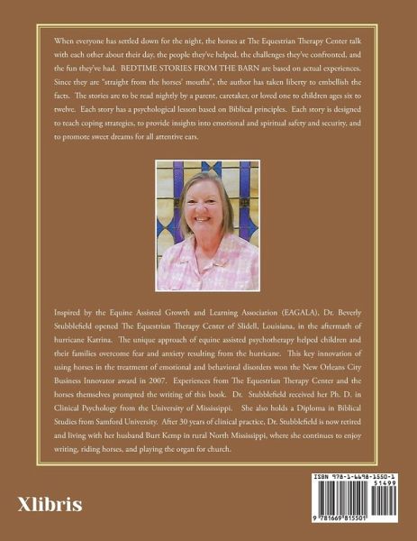 When everyone has settled down for the night, the horses at The Equestrian Therapy Center talk with each other about their day, the people they've helped, the challenges they've confronted, and the fun they've had. BEDTIME STORIES FROM THE BARN are based on actual experiences. Since they are "straight from the horses' mouths", the author has taken liberty to embellish the facts. The stories are to be read nightly by a parent, caretaker, or loved one to children ages six to twelve. Each story has a psychological lesson based on Biblical principles. Each story is designed to teach coping strategies, to provide insights into emotional and spiritual safety and security, and to promote sweet dreams for all attentive ears.