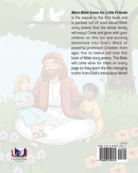 More Bible Gems for Little Friends is the sequel to the first book and is packed full of read-aloud Bible story poems that the whole family will enjoy! Come and grow with your children on this fun and exciting adventure into God's Word of powerful promises! Children from ages five to twelve will love this book of Bible story poems. The Bible will come alive for them on every page as they learn the life-changing truths from God's miraculous Word!