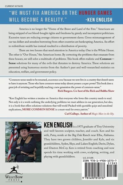 America is no longer the "Home of the Brave and Land of the Free." Americans are being stripped of our blood-bought rights and freedoms by greedy and incompetent politicians. Excessive taxes are reducing average citizens to government slaves. Gross mismanagement of our tax dollars and senseless borrowing from other countries are bankrupting America. An effort to redistribute wealth has instead resulted in a distribution of poverty. There are two houses that need attention in America today. One is the White House. The other is "Our House," the American home. By correcting the problems that emanate from these houses, we will solve a multitude of problems. This book offers realistic and Common-Sense solutions for many of the evils that threaten to destroy America. These solutions are presented using humorous stories from the Author's past and well-researched statistics on education, welfare, and government policy. "Common-sense needs to be renamed, uncommon sense because we now live in a country that doesn't seem to have it anymore. Those who have common-sense today almost possess a super power! This book does a great job of revisiting and hopefully teaching a new generation the power of common-sense." Rick Burgess. Co-host of the Rick and Bubba Show "Ken English has written a treatise on America that everyone who loves this country needs to read. Not only is it a work outlining the underlying problems we must address in our generation, but also, it is a book that offers solutions-solutions that will work! Packed with quotable quips and anecdotal explications, MORE COMMON SENSE is a must-read for every patriot." Carl Gallups. Author of Magic Man in the Sky.