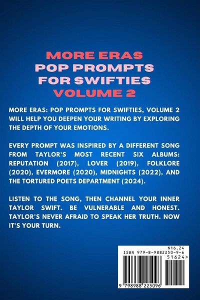 More Eras: Pop Prompts for Swifties, Volume 2 will help you explore the full range of your emotions so you can go deeper, whether you're journaling or writing a book, script, or song of your own. Every prompt in this collection was inspired by a different song from Taylor's most recent six albums: Reputation(2017), Lover (2019), Folklore (2020), Evermore (2020), Midnights (2022), and The Tortured Poets Department (2024). Listen to the song, then channel your inner Taylor Swift, and pour your heart out. Write what scares you. Write what thrills you. Be vulnerable and honest. Taylor's never afraid to speak her truth. Now it's your turn. More Eras: Pop Prompts For Swifties Volume 2 is perfect for self-reflection and self-discovery. These empowering journaling exercises are a great mental health tool. DISCLAIMER: This book is meant for educational, scholarship, and research purposes. By taking a critical look at the themes in Taylor Swift's work, we aim to inspire writers to create their own unique works of personal writing and fiction. Writers using this book are encouraged to research their own hearts and psyches in order to become scholars of their inner selves. Song titles are referenced in the spirit of Fair Use and readers should seek out and purchase Taylor Swift's music on their own as a supplement to the original writing prompts in this book. Taylor Swift has no involvement with this book. The use of her name is merely descriptive and should not be interpreted as a sign of endorsement.
