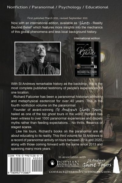 Revised 2nd edition, now with an international edition, available as 'Ghosts - Reality Beyond Belief' which features more insights into the mechanics of global phenomena and less local background history. This is the most complete published testimony of people's experiences for one location. 133 new haunted locations, 260 previously unknown ghosts, 314 new testimonies from the author, residents, students and visitors. All with St Andrews remarkable history as the backdrop. Richard Falconer has been a paranormal historian/authority and metaphysical esotericist for over 40 years. This is his fourth nonfiction volume on the paranormal. Founder of award-winning St Andrews Ghosts Tours hailed as one of the top ghost tours in the world, Richard has been witness to over 1000 paranormal experiences. He dispels myths rather than feeding expectations... No thrills, theatrics or staged scares. Like his tours on the paranormal, Richard's books are all about educating to its reality. This third revised volume for St Andrews is a follow up to the local bestseller 'Ghosts of St Andrews'. With extensive updates & cross-referencing this can easily be read as a standalone. This is a record of paranormal activity on tours between 2014 and 2020, along with those coming forward with the same since 2013 and spanning many more years. Also included are insights into the mechanics of global phenomena.