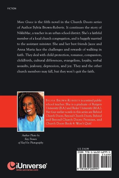 More Grace is the fifth novel in the Church Doors series of Author Sylvia Brown-Roberts. It continues the story of NikkiMac, a teacher in an urban school district. She's a faithful member of a local church congregation, and is happily married to the assistant minister. She and her best friends Jacee and Anna Maria face the challenges and rewards of walking in faith. They deal with child protection, romance, compassion, childbirth, cultural differences, evangelism, loyalty, verbal assaults, jealousy, depression, and joy. They and the other church members may fall, but they won't quit the faith.