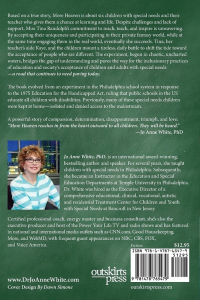 Based on a true story, More Heaven is about six children with special needs and the remarkable teacher who gives them a chance at learning and life. Despite challenges and a lack of support, Miss Tina Randolph's commitment to reach, teach, and inspire these children is unwavering. By accepting their uniqueness and participating in their private fantasy world, while at the same time engaging them in the real world, she eventually succeeds. Tina, her quick-witted teacher's aide Kaye, and the children mount a tireless, daily battle to shift the tide toward the acceptance of people who are different. The experiment, begun in chaotic, uncharted waters, bridges the gap of understanding and paves the way for the inclusionary practices of education and society's acceptance of children and adults with special needs. This is a road that continues to need paving, making the messages in More Heaven equally relevant today. The book evolved from an experiment in the Philadelphia school system in the late 1970s in response to the 1975 Education for the Handicapped Act, ruling that public schools in the US educate all children with disabilities, despite their severity. Previously, many of these special needs children were kept at home-isolated and denied access to the mainstream. More Heaven is a powerful story of compassion, determination, disappointment, triumph, and love.
