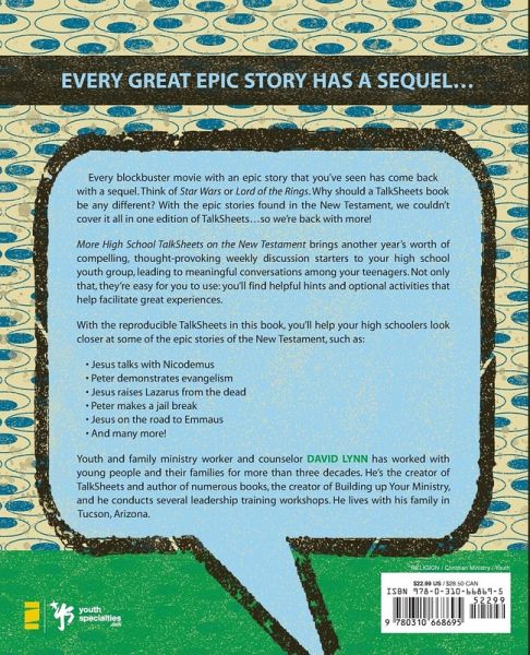 Every blockbuster movie with an epic story that you've seen has come back with a sequel. Think of "Star Wars" or "Lord of the Rings." Why should a TalkSheets book be any different? With the epic stories found in the New Testament, we couldn't cover it all in one edition of TalkSheets...so we're back with more! More High School TalkSheets on the New Testament, Epic Bible Stories brings another year's worth of compelling and thought provoking weekly discussion starters to your high school youth group, leading to meaningful conversations among the teenagers in your group. Not only that, they're easy for you to use: You'll find helpful hints and optional activities that help facilitate great conversations. With the reproducible TalkSheets in this book, you'll help your high school students look closer at some of the epic stories of the New Testament, like: ¿ Jesus eats dinner with a bunch of sinners ¿ Peter demonstrates evangelism ¿ Jesus preaches for six hours ¿ Peter makes a jail break ¿ Jesus tells a story of the rich man and Lazarus ¿ And many more!