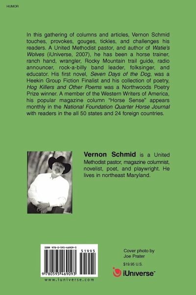 In this gathering of columns and articles, Vernon Schmid touches, provokes, gouges, tickles, and challenges his readers. A United Methodist pastor, and author of Watie's Wolves (iUniverse, 2007), he has been a horse trainer, ranch hand, wrangler, Rocky Mountain trail guide, radio announcer, country, rock-a-billy, folksinger and educator. His first novel, Seven Days of the Dog, was a Heekin Group Fiction Finalist and his collection of poetry, Hog Killers and Other Poems was a Northwoods Poetry Prize winner. A member of the Western Writers of America, his popular magazine column "Horse Sense" appears monthly in the National Foundation Quarter Horse Journal with readers in the all 50 states and 24 foreign countries.