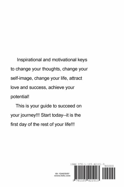 Inspirational and motivational keys to change your thoughts, change your self-image, change your life, attract love and success and achieve your potential. This is your guide to succeed on your life's journey. Begin today--this is the first day of the rest of your life!!!
