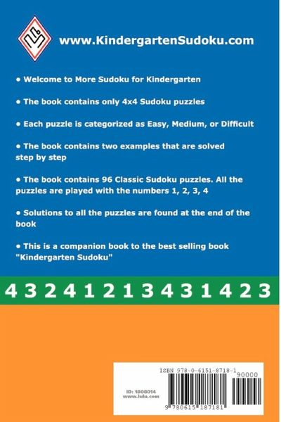 This is a book containing Classic Sudoku puzzles for children in kindergarten - ages 4 - 8 years and up. All the puzzles in the book are 4 x 4 Sudoku puzzles designed specially for these children in mind. Classic Sudoku rules are easy - each number 1, 2, 3, and 4 must appear only once in each row, column, or block. There are 96 classic puzzles in the book. In addition, there are two example puzzles that are solved in a step-by-step manner. The puzzles are of three types - Easy, Medium, or Difficult. The solutions to all the puzzles in the book are available at the end of the book. The book has a website at www.KindergartenSudoku.com where you can download and print additional puzzles like the ones in the book. This is a companion book to the best selling book "Kindergarten Sudoku: 4x4 Sudoku Puzzles for Kids".