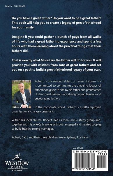 Do you have a great father? Do you want to be a great father? This book will help you to create a legacy of great fatherhood for your family. Imagine if you could gather a bunch of guys from all walks of life who had a great fathering experience and spend a few hours with them learning about the practical things that their fathers did. That is exactly what More Like the Father will do for you. It will provide you with wisdom from sons of great fathers and set you on a path to build a great fatherhood legacy of your own.