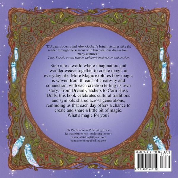 Step into a world where imagination and wonder weave together to create magic in everyday life. More Magic explores how magic is woven from threads of creativity and connection, with each creation telling its own story. From Dream Catchers to Corn Husk Dolls, this book celebrates cultural traditions and symbols shared across generations, reminding us that each day offers a chance to create and share a little bit of magic. What's magic for you?