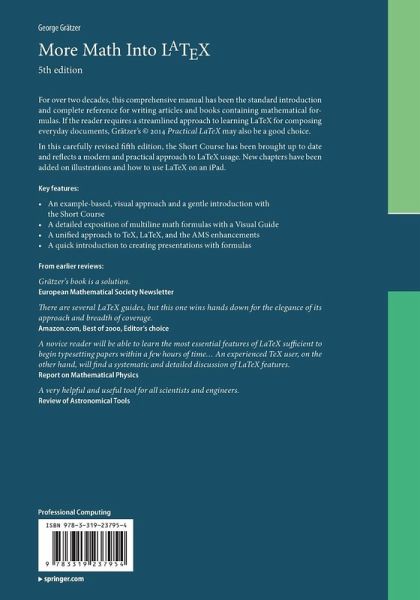 An example-based, visual approach and a gentle introduction with the Short CourseA detailed exposition of multiline math formulas with a Visual GuideA unified approach to TeX, LaTeX, and the AMS enhancementsA quick introduction to creating presentations with formulas