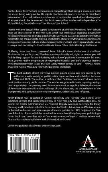 The book collects thirty-two opinion pieces, essays, and two poems published by the author in leading media on a wide variety of public policy topics as recently as 2022. The articles and poems range over six broad areas: the moderation ideal, as illustrated by the abortion issue; American exceptionalism; civic discourse; the Trump presidency; campus life; and immigration, citizenship, and refugee policy. The author, a self-described "militant moderate," draws on his participation as a commentator in these and many other public debates.
