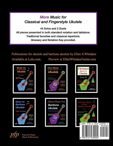 Fourty-four familiar pieces (folk tunes and classical music) arranged for ukulele (low G). There are 42 solos and 2 duets. All music is presented in both standard notation and tablature. The level of expertise necessary to play the pieces varies widely, from easy to advanced, with most falling into the intermediate range. The pieces are loosely arranged from easier to more challenging. This book may be previewed at EllenWhitakerGuitar.com. With the goal of providing an interesting variety, the book includes instrumental arrangements of traditional folk tunes from a variety of origins, a ragtime piece by Scott Joplin, a klezmer tune, an original blues tune, and arrangements of classical pieces by various well-loved composers. Some of the classical pieces are adaptations for ukulele of popular guitar or lute works that many classical guitar students are familiar with, including professional level repertoire. Other classical pieces in this volume were originally written for sizable ensembles or keyboard instruments and are arranged here for solo ukulele. A Glossary and a Notation Key are provided.