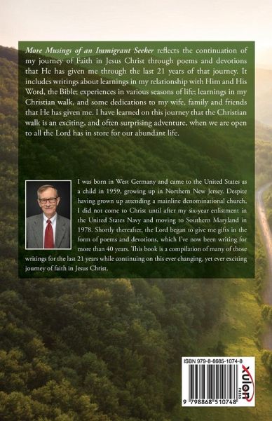 More Musings of an Immigrant Seeker reflects the continuation of my journey of Faith in Jesus Christ through poems and devotions that He has given me through the last 21 years of that journey. It includes writings about learnings in my relationship with Him and His Word, the Bible; experiences in various seasons of life; learnings in my Christian walk, and some dedications to my wife, family and friends that He has given me. I have learned on this journey that the Christian walk is an exciting, and often surprising adventure, when we are open to all the Lord has in store for our abundant life. I was born in West Germany and came to the United States as a child in 1959, growing up in Northern New Jersey. Despite having grown up attending a mainline denominational church, I did not come to Christ until after my six-year enlistment in the United States Navy and moving to Southern Maryland in 1978. Shortly thereafter, the Lord began to give me gifts in the form of poems and devotions, which I've now been writing for more than 40 years. This book is a compilation of many of those writings for the last 21 years while continuing on this ever changing, yet ever exciting journey of faith in Jesus Christ.