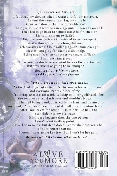 When good goes bad in the latest installment of Laura Pavlov's star-crossed lovers trilogy, you'll want to be there every step of the way. Life is sweet until it's not... I followed my dreams when I wanted to follow my heart. I spent the summer touring with the band. Cruz Winslow is the love of my life and being with him 24/7 was amazing, until it came to an end. I needed to go back to school while he finished up his commitment to Exiled. But, that one decision threatened to tear us apart. And although I knew a long-distance relationship would be challenging-the time change, classes, studying for exams didn't help. Being away from one another was more difficult than I ever imagined. There was no doubt in my mind he was the one for me, but was true love going to be enough? Because I gave him my heart, and he promised me forever... I'm living a dream that isn't even mine... As the lead singer of Exiled, I've become a household name, and everyone wants a piece of me. I'm trying to maintain a relationship with my girlfriend-but the road was a cruel mistress and wouldn't let go. I'm chained to my band, chained to my fans, and chained to my family. And I don't want any of it -all I want is More Jade. After Jade leaves for school, I miss her like hell and backslide into my old ways. It kills me because she's the one person I don't want to disappoint. I love her so much, but deep down I know she deserves a hell of a lot better than me. I know I need to set her free. But I can't let her go... Because what if she doesn't come back? A connected series of first love best read in order: More Jade More of You More of Us