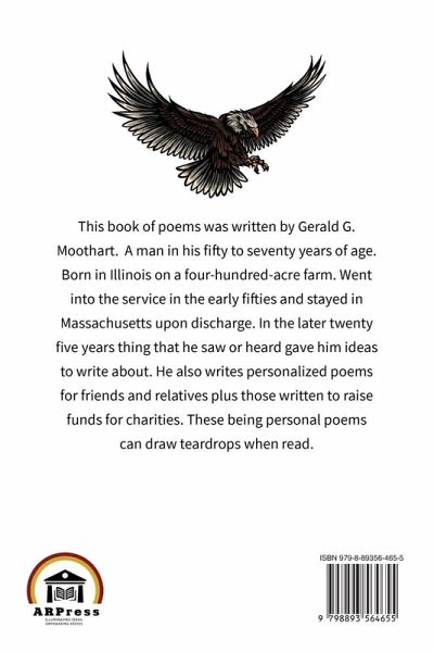 This book of poems was written by Gerald G. Moothart. A man in his fifty to seventy years of age. Born in Illinois on a four-hundred-acre farm. Went into the service in the early fifties and stayed in Massachusetts upon discharge. In the later twenty five years thing that he saw or heard gave him ideas to write about. He also writes personalized poems for friends and relatives plus those written to raise funds for charities. These being personal poems can draw teardrops when read.