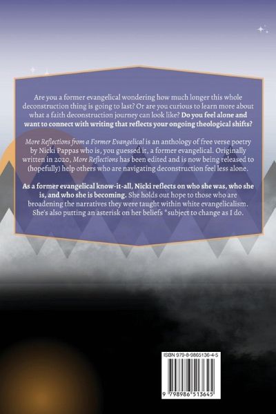 Are you a former evangelical wondering how much longer this whole deconstruction thing is going to last? Or are you curious to learn more about what a faith deconstruction journey can look like? Do you feel alone and want to connect with writing that reflects your ongoing theological shifts? More Reflections from a Former Evangelical is an anthology of free verse poetry by Nicki Pappas who is, you guessed it, a former evangelical. Originally written in 2020, More Reflections has been edited and is now being released to (hopefully) help others who are navigating deconstruction feel less alone. As a former evangelical know-it-all, Nicki reflects on who she was, who she is, and who she is becoming. She holds out hope to those who are broadening the narratives they were taught within white evangelicalism. She's also putting an asterisk on her beliefs *subject to change as I do.