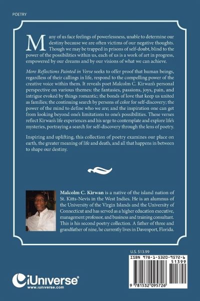 Many of us face feelings of powerlessness, unable to determine our destiny because we are often victims of our negative thoughts. Though we may be trapped in prisons of self-doubt, blind to the power of the possibilities within us, each of us is a work of art in progress, empowered by our dreams and by our visions of what we can achieve. More Reflections Painted in Verse seeks to offer proof that human beings, regardless of their callings in life, respond to the compelling power of the creative voice within them. It reveals poet Malcolm C. Kirwan's personal perspective on various themes: the fantasies, passions, joys, pain, and intrigue evoked by things romantic; the bonds of love that keep us united as families; the continuing search by persons of color for self-discovery; the power of the mind to define who we are; and the inspiration one can get from looking beyond one's limitations to one's possibilities. These verses reflect Kirwan's life experiences and his urge to contemplate and explore life's mysteries, portraying a search for self-discovery through the lens of poetry. Inspiring and uplifting, this collection of poetry examines our place on earth, the greater meaning of life and death, and all that happens in between to shape our destiny.