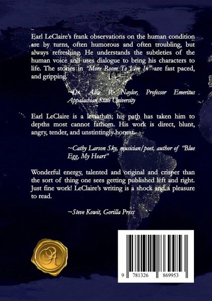 Earl LeClaire's frank observations on the human condition are by turns, often humorous and often troubling, but always refreshing. He understands the subtleties of the human voice and uses dialogue to bring his characters to life. The stories in "More Room To Live In" are fast paced, and gripping. ~Dr. Alice P. Naylor, Professor Emeritus Appalachian State University Earl LeClaire is a leviathan; his path has taken him to depths most cannot fathom. His work is direct, blunt, angry, tender, and unstintingly honest. ~Cathy Larson Sky, musician/poet, author of "Blue Egg, My Heart" Wonderful energy, talented and original and crisper than the sort of thing one sees getting published left and right. Just fine work! LeClaire's writing is a shock and a pleasure to read. ~Steve Kowit, Gorilla Press