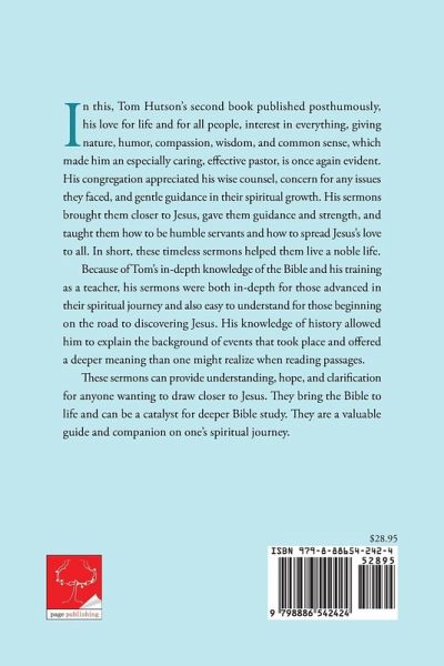 In this, Tom Hutson's second book published posthumously, his love for life and for all people, interest in everything, giving nature, humor, compassion, wisdom, and common sense, which made him an especially caring, effective pastor, is once again evident. His congregation appreciated his wise counsel, concern for any issues they faced, and gentle guidance in their spiritual growth. His sermons brought them closer to Jesus, gave them guidance and strength, and taught them how to be humble servants and how to spread Jesus's love to all. In short, these timeless sermons helped them live a noble life. Because of Tom's in-depth knowledge of the Bible and his training as a teacher, his sermons were both in-depth for those advanced in their spiritual journey and also easy to understand for those beginning on the road to discovering Jesus. His knowledge of history allowed him to explain the background of events that took place and offered a deeper meaning than one might realize when reading passages. These sermons can provide understanding, hope, and clarification for anyone wanting to draw closer to Jesus. They bring the Bible to life and can be a catalyst for deeper Bible study. They are a valuable guide and companion on one's spiritual journey.
