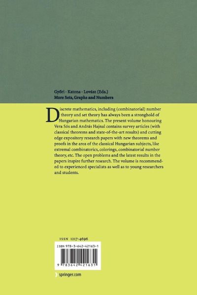 A Unifying Generalization of Sperner's Theorem.- A Quick Proof of Sprindzhuk's Decomposition Theorem.- Discrepancy in Graphs and Hypergraphs.- Biplanar Crossing Numbers I: A Survey of Results and Problems.- An Exercise on the Average Number of Real Zeros of Random Real Polynomials.- Edge-Connection of Graphs, Digraphs, and Hypergraphs.- Perfect Powers in Products with Consecutive Terms from Arithmetic Progressions.- The Topological Version of Fodor's Theorem.- Color-Critical Graphs and Hypergraphs with Few Edges: A Survey.- Pseudo-random Graphs.- Bounds and Extrema for Classes of Graphs and Finite Structures.- Relaxing Planarity for Topological Graphs.- Notes on CNS Polynomials and Integral Interpolation.- The Evolution of an Idea - Gallai's Algorithm.- On the Number of Additive Representations of Integers.- A Lifting Theorem on Forcing LCS Spaces.- Extremal Functions for Graph Minors.- Periodicity and Almost-Periodicity.