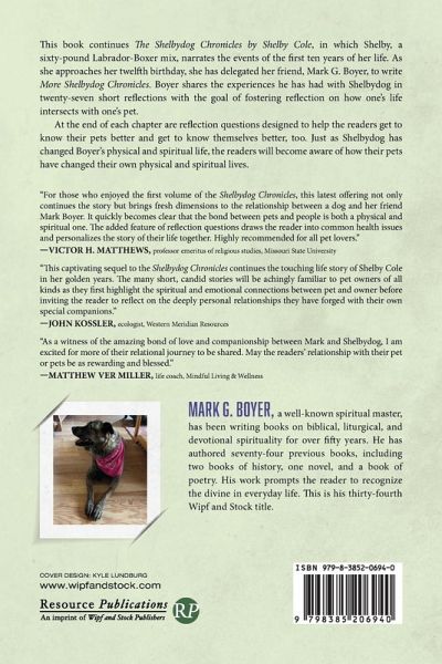 This book continues The Shelbydog Chronicles by Shelby Cole, in which Shelby, a sixty-pound Labrador-Boxer mix, narrates the events of the first ten years of her life. As she approaches her twelfth birthday, she has delegated her friend, Mark G. Boyer, to write More Shelbydog Chronicles. Boyer shares the experiences he has had with Shelbydog in twenty-seven short reflections with the goal of fostering reflection on how one's life intersects with one's pet. At the end of each chapter are reflection questions designed to help the readers get to know their pets better and get to know themselves better, too. Just as Shelbydog has changed Boyer's physical and spiritual life, the readers will become aware of how their pets have changed their own physical and spiritual lives.